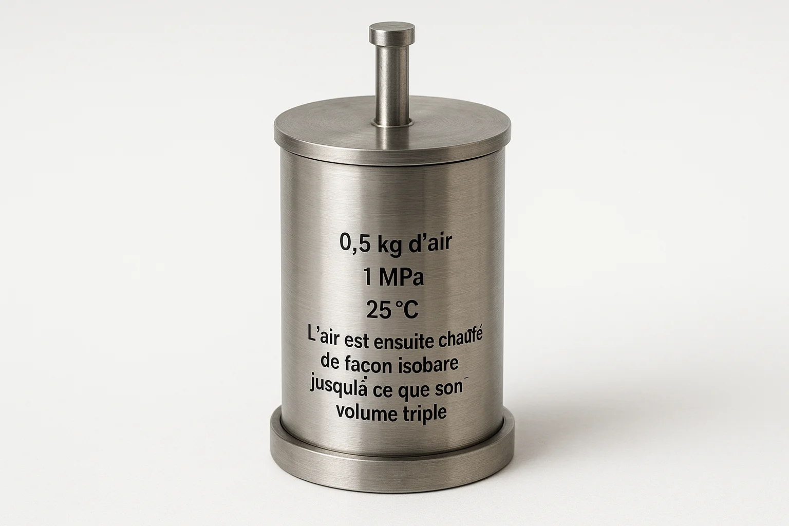 Cet exercice porte sur l'étude d'un système thermodynamique fermé contenant de l'air, considéré comme un gaz parfait. Le système subit une transformation isobare, c'est-à-dire une évolution à pression constante. Nous analyserons les échanges d'énergie (travail et chaleur) et la variation de l'énergie interne de l'air au cours de ce processus, qui est fondamental dans de nombreuses applications industrielles comme les moteurs thermiques ou les turbines à gaz.